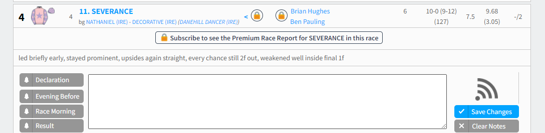 Brian Hughes won races 3 and 4. His next ride was in the 5th on Severance BSP 9.68 In running traded at a low of 2.0.