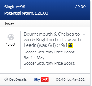 Bournemouth & Chelsea to win & Brighton to draw with Leeds (was 6/1) Boosted to 9/1