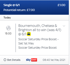 As with every Soccer Saturday Price Boost, SkyBet offer 3 outcomes and this week they have offered this last game as the alternate options