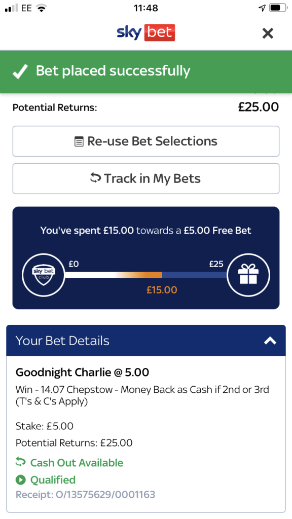 A change in tack 😜 for this bet means we head off to Chepstow for the 14:07 Easter Titles at Oliversbookshop.co.uk Handicap Chase. I received a tip last night for Goodnight Charlie from one of the lads in Smithfield Market so when I got home this morning had a look at its recent form and its last 3 outings were at Warwick over progressivly longer distances with the last one over 3m 5f where it placed on good to soft ground. Todays race is over a still slightly longer 3m 6f 130yds with a good going and good to soft in places. This horse has only run on good or good to soft ground 16 times Winning 3 times and placing 5 times. This race is the furthest she has raced and after starting at 12/1 in her last race a forcast S.P. today of 4/1 you could be excused for thinking at least a place today. I also have the added bonus that should she not win but place 2nd or 3rd then @SkyBet will give me my stake back.