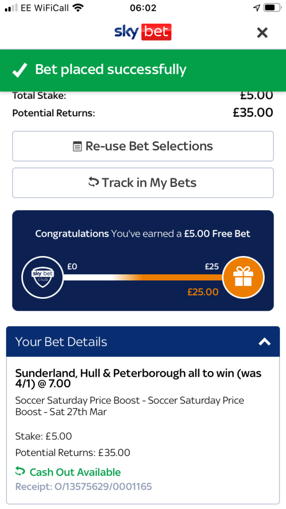 This years Cheltenham Festival saw me enter the fray with over £300 in free bets from SkyBet, whos’ free bets never expire. I managed to convert that to over £199.64 with the help of the money back offers. It is now time to start saving for next year and my first £5.00 free bet is already in the bag due to this weeks bets already settled. and will be credited this Monday. These series of Blog posts will track my bets each week, hopefully ending up in profit as well as having at least £260 in free bets by next March in time for next years Festival. As well as the regular weekly £5.00 free bet for wagering £25.00 there are plenty more opportunities that they offer so follow me on twitter as well as this blog to join in if you want.