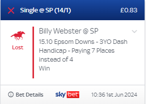 Second to run was Billy Webster in the 3:10 again at Epsom. Published at 9:24 at advised odds of 10/1. I again backed this at S.P. for a stake of 83p as the odds available at 10:30 were down to 6/1