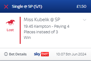 Third and Final runner was Miss Kubelik who in actual fact didnt even place but went off at odds of 5/1 (6.00) this was greater than the advised odds