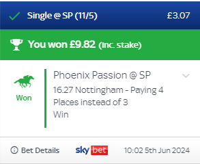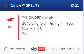 By Post Time the odds had drifted to 14/1 which would have given a profit of £11.62 if it had won.