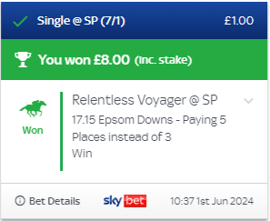 Taylors next selection to run was also at Epsom and he tipped Relentless Voyager in the 5:15 at an advised price of 13/2 (7.5) at the publication time of 9:03. By 10:30 these odds had sunk to 4/1 or 5.0 in decimal. Backed at S.P. for a stake of £1.00 to reap a £5.00 profit if the odds didn’t sink further.