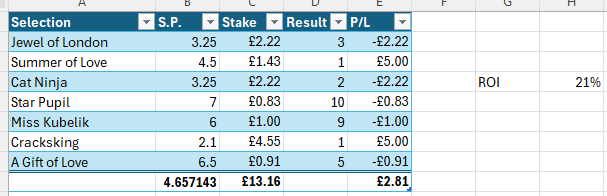 The odds for Swiatek to win the final were 1.42 which I laid for a stake of £2.38 this meant that if she did win my Tournament profit would be £9.48 or if Anisimova won my profit for the tournament would finish up at £12.86.