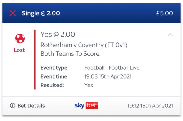 As you can see from the bet slip I only had to wait 9 minutes for the odds to get to 2.0 for all the good it did🤣