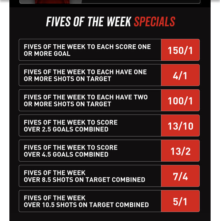 “Fives of the week to each have one or more shots on target” 100/1 Lost