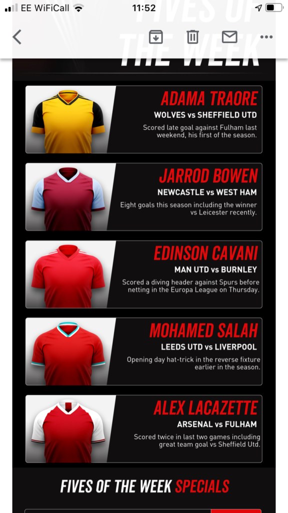 Each week, as well as the free fives game run by VirginBet they also do something that they call Team Fives Weekly, and basically it is the top 5 strikers of the week and a selection of bets associated with these players in terms of goals scored or shots on target.